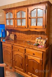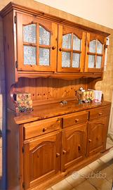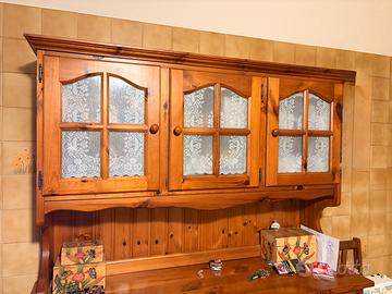 Vendo credenza cristalliera rustica in legno massello, stile country o "tirolese", ideale per arredare taverne, cucine o case di montagna. La credenza ha tre cassetti superiori e tre ante inferiori con pannelli bugnati. La vetrina ha tre ante con inserti in vetro. legno di pino massiccio, color miele o naturale. CONDIZIONI ECCELLENTI Mis 150 x 190 x 46 Euro 300 Ritiro secondo piano. Campobasso
