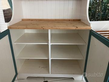 Credenza in legno massello , dai colori che ricordano il mare. Con piano amovibile per il taglio del pane. Misure: 129 L 201 H 69 P Sportelli inferiori con chiave Borchia chiave da ripristinare