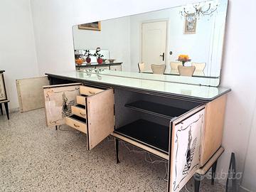 Credenza anni '50 di Umberto Mascagni for Harrods, completa di specchiera rimovibile. Il mobile è composto da quattro ante e cassetti, ed è realizzato in legno pieno con finiture in similpelle color crema e dettagli in vinile nero. Il top e le ante sono rifiniti con vetro, mentre l’interno è rivestito in vinile nero decorato, fatta eccezione per i cassetti, che presentano un rivestimento in vinile grigio. Un pezzo d’arredo dal design distintivo e iconico, ideale per ambienti vintage o eclettici.