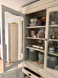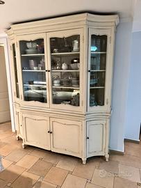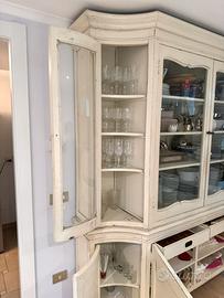 Parte Superiore (Vetrina): 4 ante con ampie vetrate sagomate. All'interno è dotata di robusti ripiani ideali per esporre servizi di piatti, calici e porcellane.