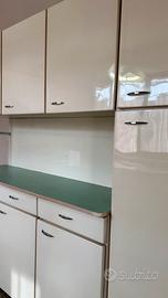 Realizzata in legno e formica color crema con piano verde acqua, questa cucina è composta da moduli superiori e inferiori, con ampio spazio contenitivo, cassetti, ante e vano a colonna laterale.