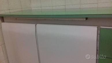 Credenza cucina vintage anni ’60 (base) - modernariato, in fòrmica bianca e verdina - in buonissimo stato generale - con 4 CASSETTI - con PROLUNGA ESTRAIBILE A SCOMPARSA (larghezza 67,5 cm, profondità 25 cm) - profilo portina sagomato Dimensioni base: lunghezza 123 cm profondità 43 cm altezza 87,5 cm Prezzo trattabile Si trova a Padova