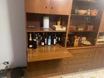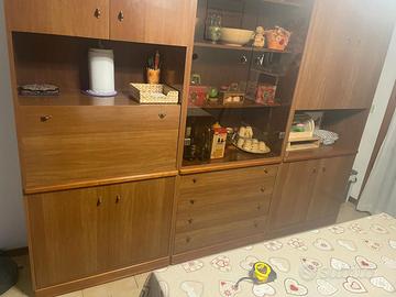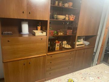 credenza da cucina, 245 cm x 208 cm, in legno. Sportelli in alto ed in basso ai lati del mobile con vetrina centrale, 4 cassetti ed un vano porta bottiglie. Smontaggio e ritiro a carico dell'acquirente.