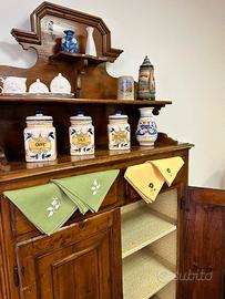 Vendo credenza antica di fine ‘800, in condizioni perfette, in legno di abete, con due cassetti, vano contenitore a doppia anta e alzatina superiore con mensole. Gli interni sono tutti rivestiti in carta adesiva che in alcuni punti andrebbe sostituita. La parte superiore costituita dall’alzatina con le mensole è separabile dal mobile, così da agevolarne trasporto e ricollocazione.