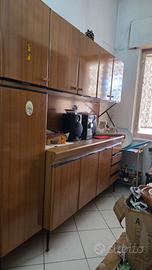 Credenza con colonna lunga e pensile, piu 4 sportelli sopra e 3 sotto e 4 cassetti. Qualche supporto delle aperture danneggiato. Ma già sostituito da pomelli x apertura. Misura larghezza 1.97.