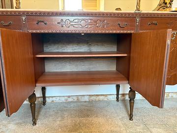 mobile antico in legno scuro, con intagli decorativi elaborati e gambe tornite. Sopra il mobile è posizionato un grande specchio con una cornice dorata riccamente decorata con motivi ornamentali floreali e barocchi. Lo specchio è suddiviso in tre sezioni da colonne decorative. Prezzo trattabile e spedizine a carico dell’acquirente