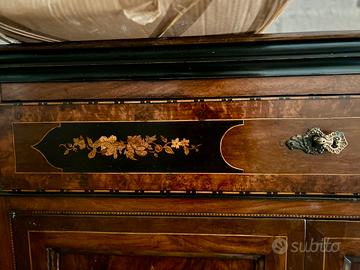 CREDENZA A DUE ANTE ED UN CASSETTO FINEMENTE INTARSIATA E FILETTATA CON VARIE ESSENZE. DECORAZIONI AD INTAGLIO A MOTIVO FLOREALE SUI LATI . PIEDINI TORNITI A "CIPOLLA" EPOCA LUGI FILIPPO 1840-60). PROVENIENZA: NORD ITALIA. Misure: p 55* l 127 * h 128