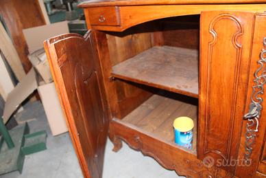Vendo per un amico una Credenza della Provenza a due corpi in legno di “Noce” appena ristrutturata, in stile Luigi XV del 1850, quattro sportelli decorati con volute, fascia inferiore scolpita con cesto e tralci. All'interno del corpo superiore, tre cassetti.