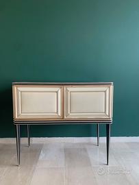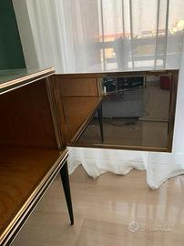 Struttura a due ante in legno massello interamente rivestita in pelle panna, profili in ottone dorato. L'interno delle ante è a specchio. Il piano, anch'esso in pelle, è protetto da una lastra di vetro trasparente. Produzione italiana. Oggetto di design vintage.