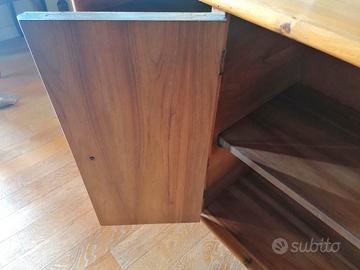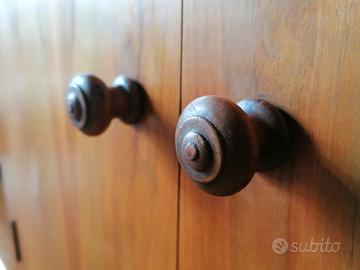 Credenza dispensa bassa, salvaspazio, anni '50/'60, originale, in legno massello e impiallacciato di faggio, tinta miele/arancio (pianale e ripiani con telaio a doghe, fianchi e fondo impiallacciati, schienale con pannello in fibra di legno alta densità), a due ante (profilo stondato con chiusura a pressione e ripiano centrale) con pomoli torniti e due mensole laterali a vista. Piedi a zoccolo con vernice color nero opaco.