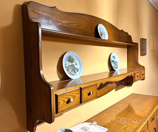 Credenza e piattaia stile rustico in legno di rovere. Dimensioni credenza: L 224,5 x P 48,6 × H 85 cm circa. Dimensioni piattaia: L 177,2 x P 26,5 x H 91,7 cm circa. Molto ben tenute. Relativi tavolo, sedie, buffet e tavolino da salotto in altri annunci.