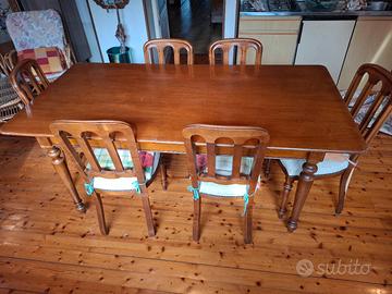Credenza e tavolo in legno con sei sedie imbottite