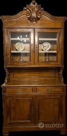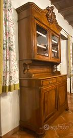 Bellissima credenza con vetrina superiore, costruita artigianalmente in noce. Collocabile in epoca fine 800, regala una grande eleganza e delle ottime proporzioni. Incastri a coda di rondine, interamente originale in ogni sua parte. La credenza d'epoca ha i pomelli in ottone brunito ed è perfettamente restaurata. Subito collocabile, si presta ad arricchire anche ambienti moderni.