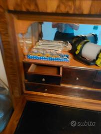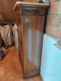Vendo credenza finitura noce con ripiano in marmo, altezza 150cm, larghezza 100cm e profondità 45cm. 3 cassetti, 1 cassetto segreto sotto il ripiano e ripiano tipo scrittoio con specchio interno e 8 cassettini interni.. NON SPEDISCO.