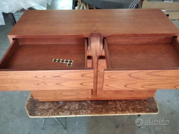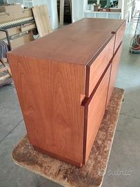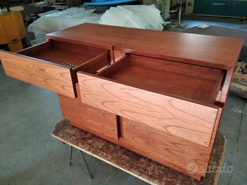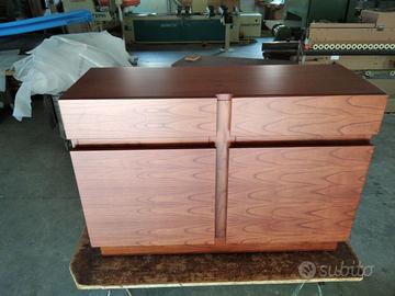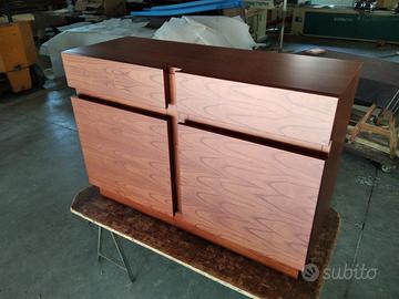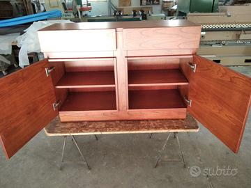 Credenza costruita con essenza listellare ricoperto di ciliegio (come richiesto dal cliente) con misura con lunghezza 120 prof. 45 h 82 composta con 2 cassetti e 2 ante unita tutta a 45° a spizza e sotto zoccolo sotto rientrante. apertura tramite gola a C per apertura dei cassetti e delle ante scorreranno su guide ammortizzate e le ante si apriranno su cerniere ammortizzate in chiusura. Interno troveremo un ripiano aggiustabile in altezza. piedini livellatori interni per mettere a bolla il tutto. compreso di finitura come richiesto dal cliente lucidata tinta ciliegio imballo franco fabbrica non comprendente di iva. il mobile è già stato prodotto su specifiche del cliente su commissione di conseguenza non è in pronta consegna e non teniamo a magazzino ma essendo i diretti produttori costruiamo solo su misura in base alle proprie esigenze, per dubbi e chiarimenti contattateci. direttamente dal produttore falegname costruiamo su misura a piacere del cliente. ASTENERSI RIVENDITORI E COMMERCIANTI