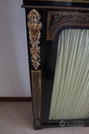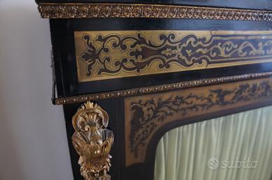 Riproduzione del XIX secolo nello stile francese di Andre Charles Boulle. Il mobile è in legno di ebano e noce parigliato. Tarsiatura in legno con ottone. I fregi in ottone sono fusi nel legno. L’intarsio è di carapace di tartaruga bruna e di ottone esterno. Doppia intarsiatura.