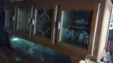 Credenza in legno, non massiccio, di colore chiaro, ancora in buone condizioni. In due porzioni separabili, con la meta’ superiore provvista di vetrine con vetri decorati, Lunga 181 cm, larga 46 e alta 180.