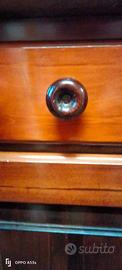 Credenza realizzata in legno massello e multistrato colore noce con finitura lucida. Blocco intero con 4 cassetti, 4 porte all' interno delle quali è posizionato un ripiano divisorio.