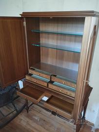 Originale credenza realizzata in legno, oggetto molto lavorato nei dettagli, è provvista di apertura con ante e cassettata internamente; al suo interno sono predisposti diversi ripiani in vetro.