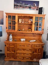elegante credenza in legno massello di pino, in ottime condizioni, ideale per arredare cucina, soggiorno o taverna in stile rustico o country. Composta da parte inferiore con 4 cassetti e 2 sportelli laterali, e parte superiore con vetrinette laterali, ripiani a giorno centrali e sportelli in vetro.