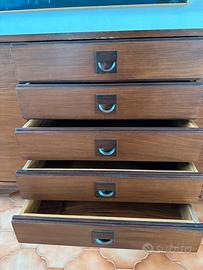 Credenza in legno di palissandro design italiano anni 60 di difficile identificazione / attribuzione a marchio specifico (Figli ci Amedeo Cassina??). Misure lunghezza cm 230 - profondità cm 47 - h cm 81. 3 ante di cui 1 doppia ed 1 singola + 5 cassetti. Articolo ben tenuto ed in ottime condizioni salvo qualche segno di usura sulla parte anteriore del primo cassetto (vedasi foto) . Disponibili altre foto con tutti i dettagli. Possibilita’ di organizzare trasporto brevi distanze a prezzo separato