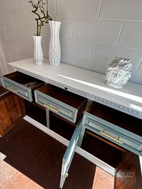 Vendo splendida credenza il legno di pino massello restaurata a mano. Il mobile è stato rivisitato con uno stile moderno ed elegante mantenendo però il fascino del pezzo originale La struttura principale è in color bianco opaco, ante e cassetti in color verde salvia infine maniglie e dettagli color oro opaco Sono state usate vernici lavabili e specifiche per il legno La finitura è quindi resistente e lavabile Un pezzo unico rinnovato con attenzione ai dettagli perfetto per chi cerca un mobile con storia ma dall’aspetto attuale. Un pezzo che unisce qualità, eleganza e originalità. Dimensioni: Lunghezza: 157cm Larghezza: 40cm Altezza: 90cm Prezzo trattabile Ritiro a mano