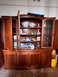 Sono presenti oggetti all’interno, ma il mobile risulta solido, senza danni gravi. Normali segni d’uso su ante e ripiani. Le vetrine sono integre.