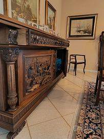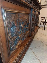 Vendo credenza in legno massello, stile classico/neorinascimentale, con pannelli frontali scolpiti in altorilievo raffiguranti scene storiche/figurative e vano con sportello vetrato. Mobile di pregio, realizzato con lavorazione artigianale, solido e ben proporzionato, ideale come arredo importante per ambienti classici. Caratteristiche: Legno massello Decorazioni scolpite a rilievo Struttura robusta e stabile Ottime condizioni generali misure 235 cm x59cm x h 103xm Disponibile anche mobile e tavoli abbinati della stessa linea (vedi altro annuncio). € 350 trattabili (disponibile alla vendita in blocco con l'altro mobile e il tavolo)