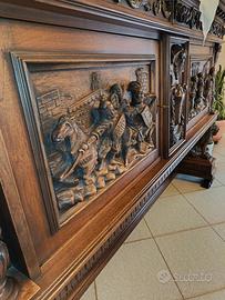 Vendo importante credenza in legno massello, stile classico/neorinascimentale, con pannelli frontali finemente scolpiti raffiguranti scene di battaglia e figure storiche. Mobile di grande qualità e impatto estetico, non produzione industriale, realizzato con lavorazione artigianale. Caratteristiche: Legno massello Sculture in altorilievo Struttura solida e stabile Ampi vani contenitori interni Ottime condizioni generali misure: 214cm x53cm xh145cm Disponibile anche mobile e tavolo con sedie abbinati della stessa linea (vedi altro annuncio). € 400,00 trattabili (disponibile alla vendita in blocco con tavolo e altro mobile)