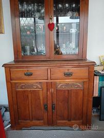 Vendo credenza antica con alzata a vetrina, in legno massello, finitura color noce, di fine '800, perfettamente conservata e ideale per arredare soggiorni, cucine rustiche, taverne o ambienti in stile vintage.