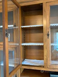 Credenza per soggiorno in legno massiccio, arte povera. 2 vetrine laterali e 3 centrali, piano d'appoggio porta TV e mensola per lettore DVD.