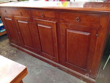 Credenza in legno massello stile arte povera, con 4 cassetti,4 antine e ripiani all'interno. Dimensioni cm 220X47X100H In buono stato, piano superiore leggermente da sistemare. Visibile e reperibile in sede. possibilità di trasporto (a carico dell' acquirente).