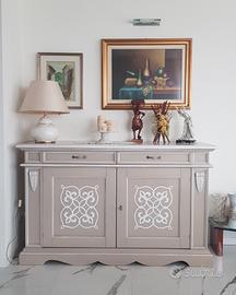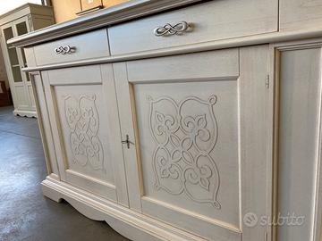 Mobile credenza da nostra azienda produttrice, visibile presso nostra esposizione, nuovo imballato, in legno massello, dispone di 2 ante e 2 cassetti, vano centrale fisso al suo interno, rilievo intagliato su anta,