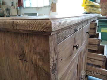 Credenza in legno di abete di antichi solai recuperati misure lunghezza 220 altezza 90 profondità 45 cm. Predisposto con zoccolo chiuso h circa 8 cm sopra troveremo 3 vani (2 laterali da 85 e quello centrale da circa 40/42) dove troveremo le ante (in luce) con chiusura chiave costruite su telaio unito dritto con pannello interno diamantato cerniere in stile e ripiano interno aggiustabili. Parte centrale 4 cassetti che scorreranno su guide in legno e apertura con pomello, parte superiore alle porte troveremo 2 cassetti capienti doppi con frontale unico. Coperta e fianchi e struttura parti esterne in legno vecchio con pattina a vista mentre interno in abete nuovo. Il tutto finito e carteggiato e levigato in modo che sia morbido al tatto. Completo di finitura cerata neutra. Iva non comprendente, costruito su commissione, non disponibile a magazzino ma possiamo riprodurlo DIRETTAMENTE DAL PRODUTTORE ASTENERSI RIVENDITORI O COMMERCIANTI