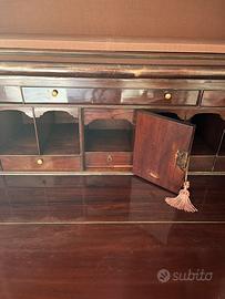La parte superiore è composta da due sportelli a vetro con l'interno foderato in tessuto e tre ripiani, la parte centrale presenta 8 nicchie con all'interno degli scomparti segreti con un anta a ribalta, profonda 28 cm.