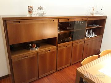 Credenza in noce provvista di cassetti, ripiani, vetrinetta e zona bar, lunghezza mt. 3,00 e altezza mt. 1,40 Tavolo in noce 1,60 x 0,85 allungabile n. 4 sedie con rivestimento seduta in stoffa
