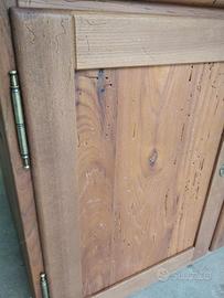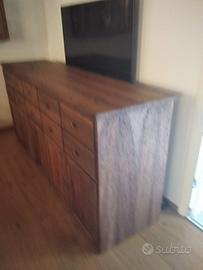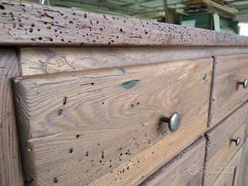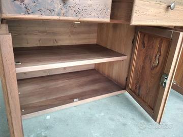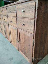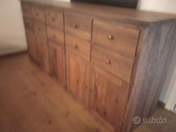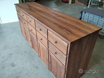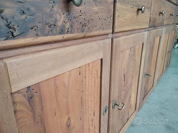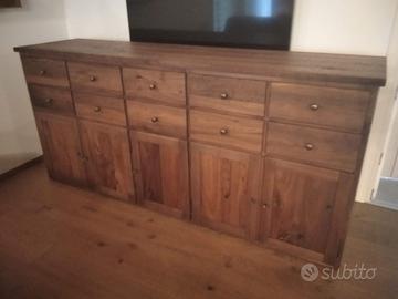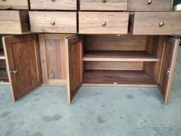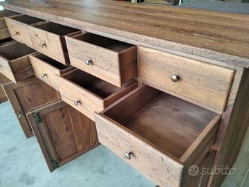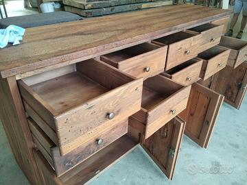 credenza in olmo massello vecchio (in cui si andrà a recuperare come richiesto dal cliente olmo vecchio direttamente da trave e poi passato al forno per antitarlo) con misura lunghezza 220 prof.55 h 100 composta da 10 cassetti che scorreranno su guide in legno tutto interno cassetto in abete in modo che internamene sia pulito apertura con pomello, nella parte sottostante troveremo 5 ante di cui 2 che si apriranno a sx e 3 a dx su cerniere (in stile regolabili battenti) su un telaio da circa 7 cm in cui internamente verrà inserito pannello massello di olmo e chiave con serratura, fondo in olmo massello senza zoccolo appoggio a terra, sollevato solo per 5 mm con tappi in gomma, internamente (struttura interna montanti verticali e orizzontali con ripiani) in abete. Schienale posteriore da 14 mm in abete avvitato. Il tutto verrà spazzolato poco e carteggiato in modo che sia tutto morbido al tatto. Completo di finitura effetto leggermente tintata per scaldare il legno. il prezzo NON COMPRENDENTE DI IVA. il mobile è già stato prodotto su commissione Non teniamo magazzino ma essendo i diretti produttori possiamo costruirla uguale o su specifiche essendo i diretti produttori. ASTENERSI RIVENDITORI E COMMERCIANTI.