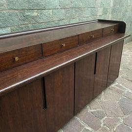 Sideboard di grande presenza scenica, caratterizzato da una linea rigorosa ed elegante tipica del miglior design italiano anni ’60. Struttura interamente impiallacciata in palissandro, con splendida venatura calda e profonda. La parte superiore presenta una fila di cassetti con pomelli in ottone, mentre il vano inferiore è chiuso da ante a battente, offrendo ampia capacità contenitiva.