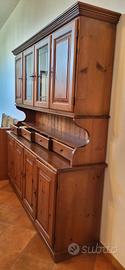 Credenza in legno di pino massello. Quattro vetrine, di cui due in vetro. Cassettiere in legno. Chiavi in ferro ottonato. Misure altezza 2,10 MT, larghezza 1,95 MT, profondità base 48 cm, pensili 36 cm. Ottimo stato, ritiro a domicilio.