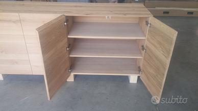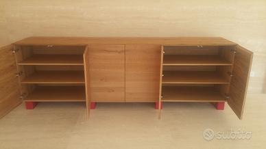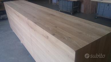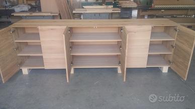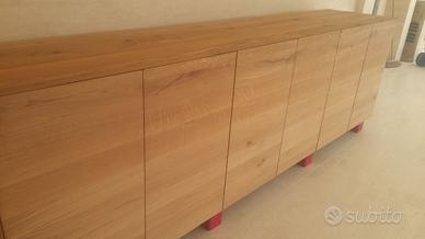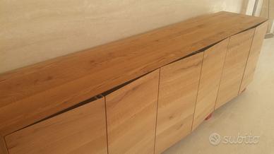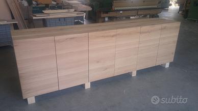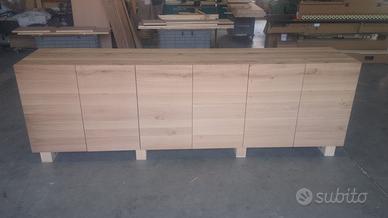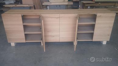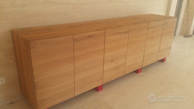 Credenza costruita a 3 strati cioè in listellare di pioppo interno con legno applicato in tutti i lati e poi placcato con essenza di rovere NUOVO che poi andremo a spazzolare tutto unito a 45° tranne lo schienale posteriore che sarà avvitato posteriormente. Le misure con lungh.300 prof.60 h 100 La costruzione della credenza avverrà tutto con giunzione a 45°coperta fianchi pendenti verticali e fondo tutto unito tramite ferramenta adatta con perni spine e barilotti con grano in modo che tutto sia unito uniformemente, ma smontabile per il trasporto. Nella parte frontale troveremo predisposto con 6 ante uguali (che verranno predisposte con la stessa venatura sulla lunghezza della credenza, in modo che tutto sia proporzionato e troveremo la disposizione interna in 3 vani separati con 2 ripiani interno aggiustabile tramite ferramenta adatta. in questa maniera tutto quanto pressato avremo le venature verticali sia per le ante sia per i fianchi che resteranno dritti nel tempo con spessore indicativo di 25 mm. Apertura tramite 3 cerniere per anta con cerniere moderne regolabili da cucina con apertura a push pull a pressione (premi apri). Dato che la credenza andrà appoggiata al muro lo schienale sarà in multistrato di rovere anch'esso spazzolato, nella parte sotto FONDO sotto come basamento zoccolo troveremo bancale in tiglio. Tutta completo di finitura neutra trasparente impermeabile effetto grezzo per la credenza e laccato rosso per le gambe. il prezzo si riferisce completo di finitura e imballo franco fabbrica iva non comprendente. il mobile è già prodotto su commissione e non teniamo magazzino ma essendo i diretti produttori possiamo fornirlo in base alle proprie esigenze per dubbi e chiarimenti contattateci per un preventivo ASTENERSI RIVENDITORI E COMMERCIANTI