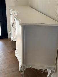 Vendo bellissima credenza in stile classico/shabby chic, perfetta per dare un tocco di eleganza e luce al tuo soggiorno o ingresso. Il mobile presenta linee sinuose e lavorazioni artigianali sui piedini e sulla base, con una raffinata finitura bianco panna che si adatta sia ad ambienti moderni che classici.