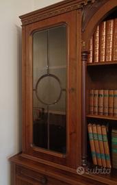Due ante in vetro a piombo, 4 cassetti, 4 ante in legno, vano centrale a giorno con colonne, cimosa intarsiata, patina originale, ferramenta originali in ottone.
