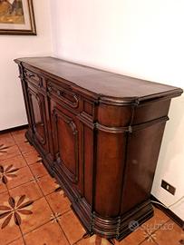 Bella credenza in stile Luigi XV dalle misure generose con due cassetti e due ripiani in legno di noce con specchiature in radica.
