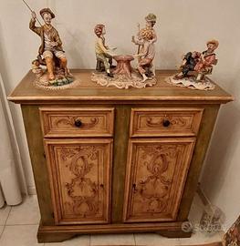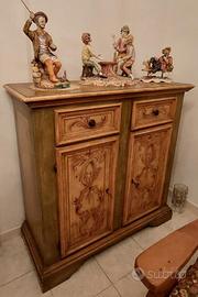 È una credenza in legno, a due ante e due cassetti, in stile rustico/tirolese degli anni ’60-80. La struttura è di colore verde salvia mentre i pannelli sono di legno chiaro. Le misure sono: 1,14 di lunghezza x 48 cm di profondità x 1,10 m di altezza.