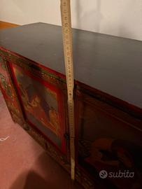 Bellissima madia in stile tibetano con pannelli dipinti a mano raffiguranti figure buddhiste e motivi simbolici tradizionali.