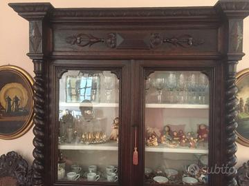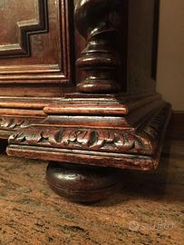 Credenza doppio corpo stile Luigi XIII con colonne e ante decorate.