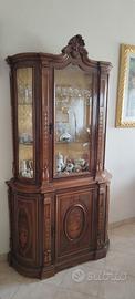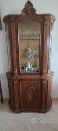 Vendo credenza in noce a doppio corpo. La parte inferiore ha uno sportello con decorazioni floreali che caratterizzano anche i fianchi. Decorazioni ad intarsio contraddistinguono tutta l’altezza del mobile. La parte superiore è costituita da un’ampia vetrina con apertura centrale. Ripiani in vetro e fondo rivestito con stoffa. Stile Maggiolini.