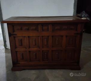 CREDENZA IN STILE SPAGNOLO, VINTAGE, DUE PEZZI, IN LEGNO E VETRO
