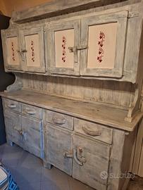 credenza in legno massello sbiancato usata nel tempo, una maniglia da aggiustare, 4 sportelli sopra 4 sotto e 4 cassetti. Molto spaziosa. Attualmente riesce a contenere piatti e pentole sotto. Scorte di cibo sopra. Ritiro in loco su appuntamento