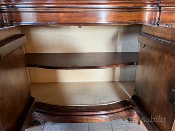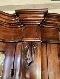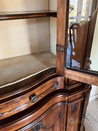 Mibile credenza in legno massello con 2 cassetti, 4 ante a vetro nella parte superiore e 4 ante in legno nella parte inferiore.